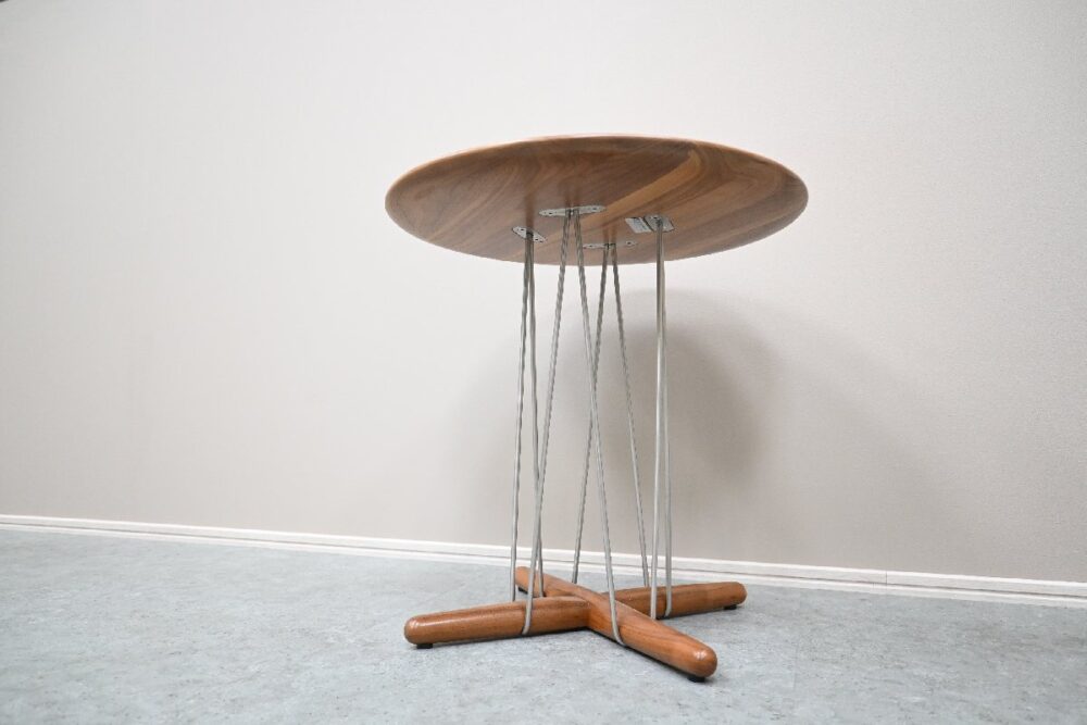 いずれも円形の木製天板が浮いたように見える、スチールワイヤー製の支柱が印象的です。
